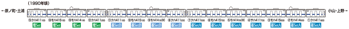●415系基本セットAと基本セットBで最大の15両編成が再現できる
