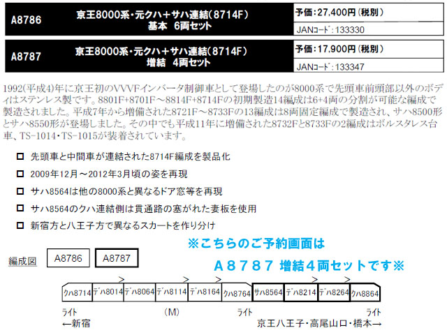 ィはステンレス製です。8801F+8701F〜8814F+8714Fの初期製造14編成は6+4両の分割が可能な編成で