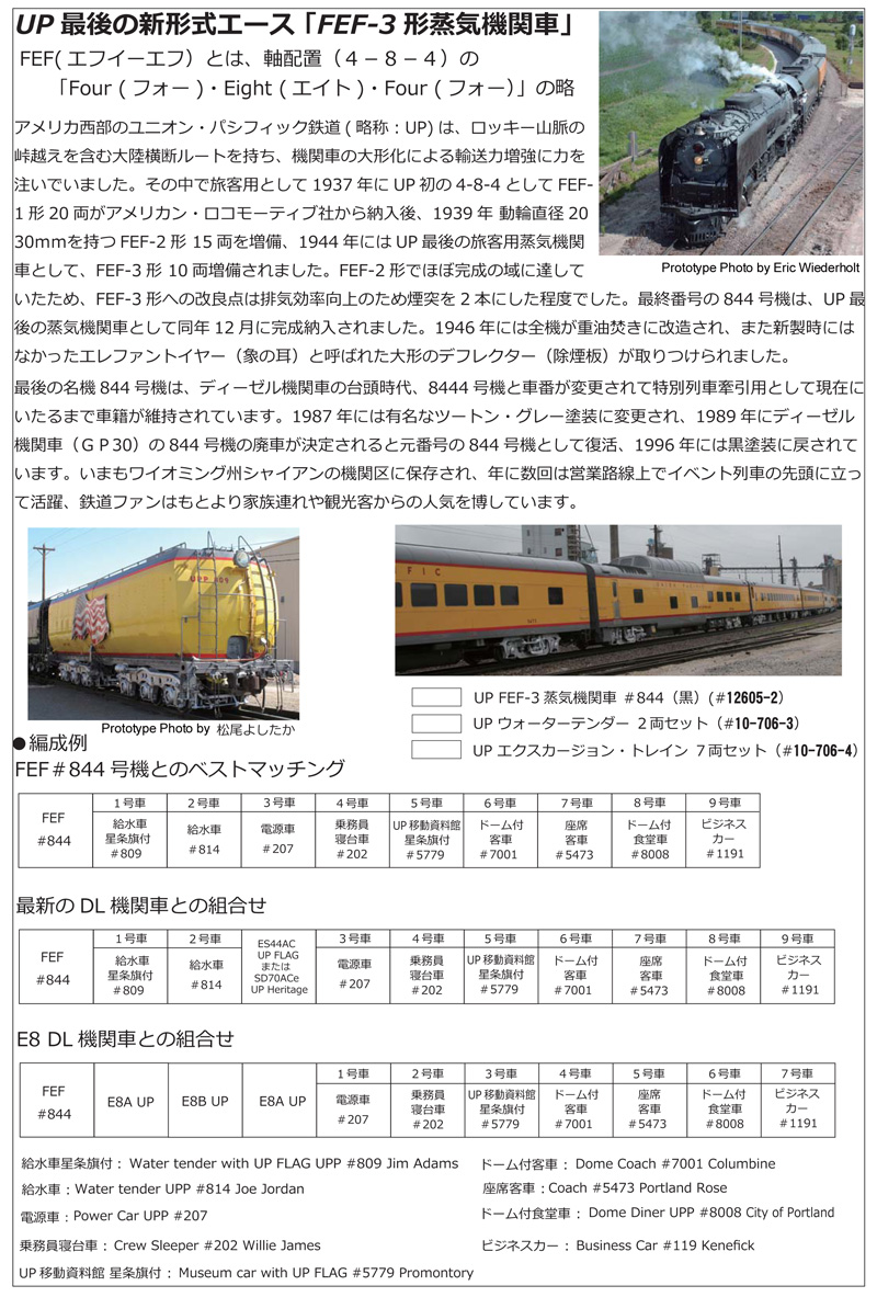 FEF-3は、アメリカの巨大鉄道会社ユニオン・パシフィック鉄道(略称:UP)が最後の蒸気機関車として、昭和19年(1944)から製造を始め、旅客牽引用として使用され活躍していましたが、昭和25年(1950)頃からディーゼル機関車の台頭により、貨物牽引を中心とした運用で最後の活躍を続けました。
