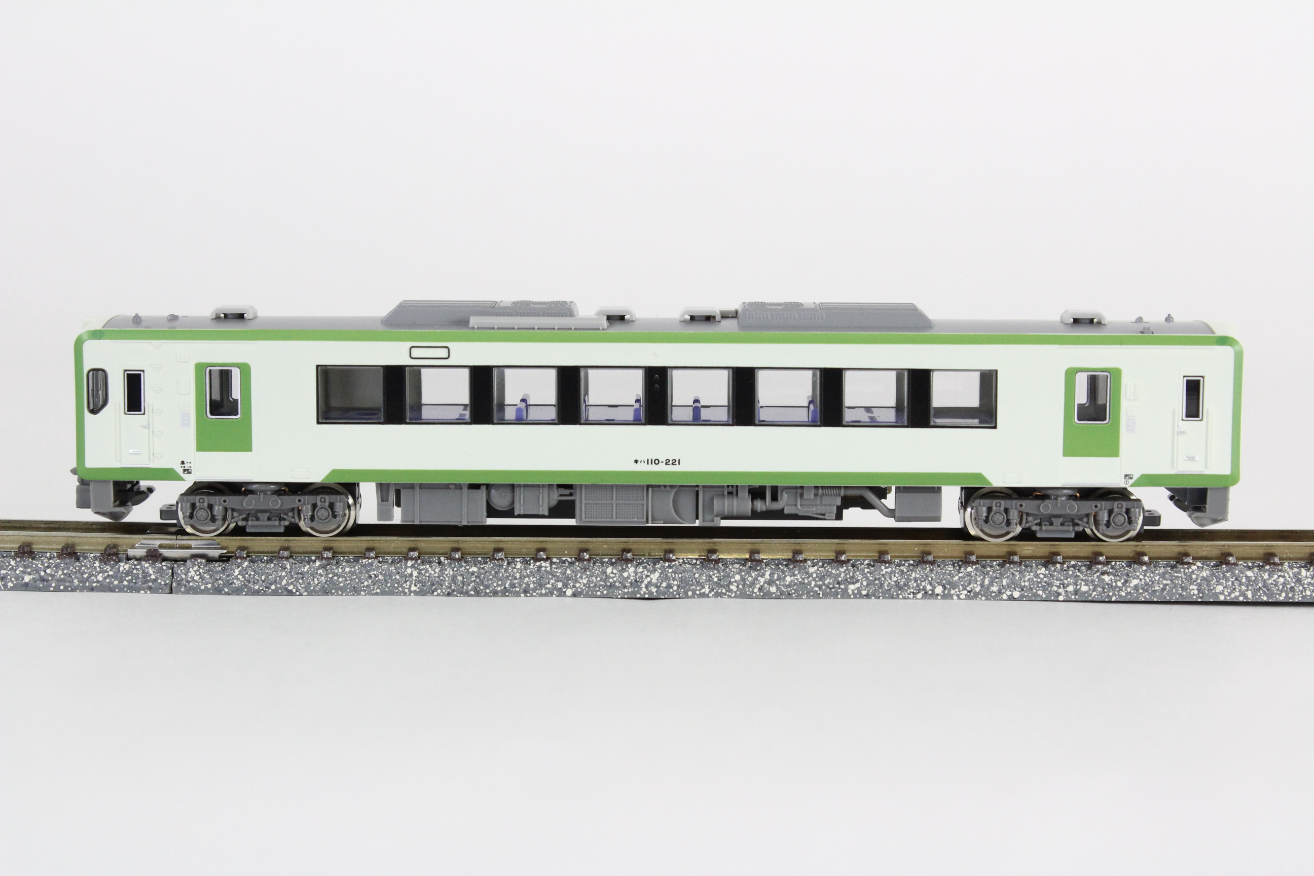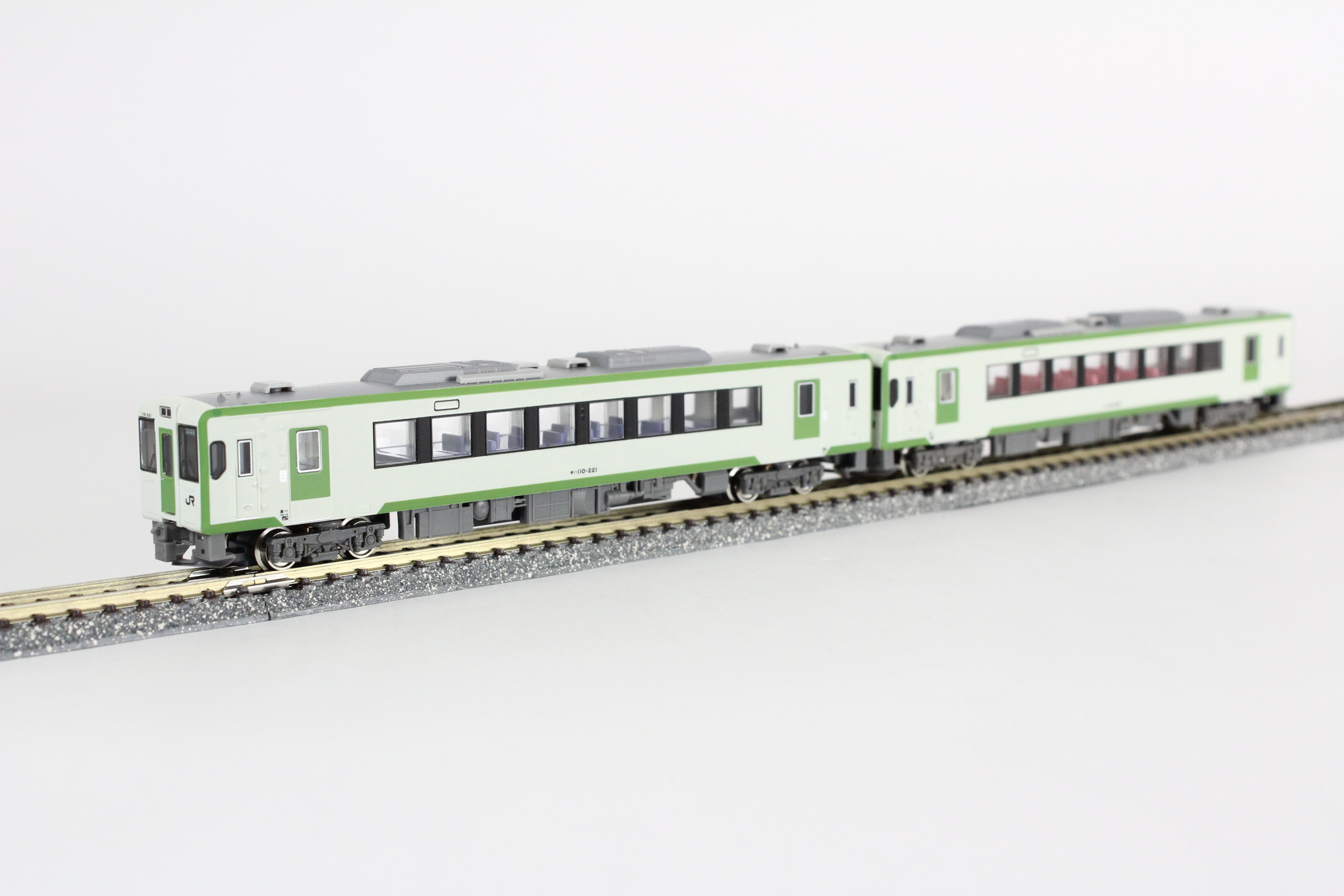 製品は八高線で活躍するキハ110形200番代をモチーフとし、同線に所属する車両の特徴である2段式になった電気連結器と側面LED行先表示を再現します。同系の標準色である、やや緑がかった白ベースにグリーンのアクセントが入った配色。両運車を2両つなげた所定の編成を再現します。