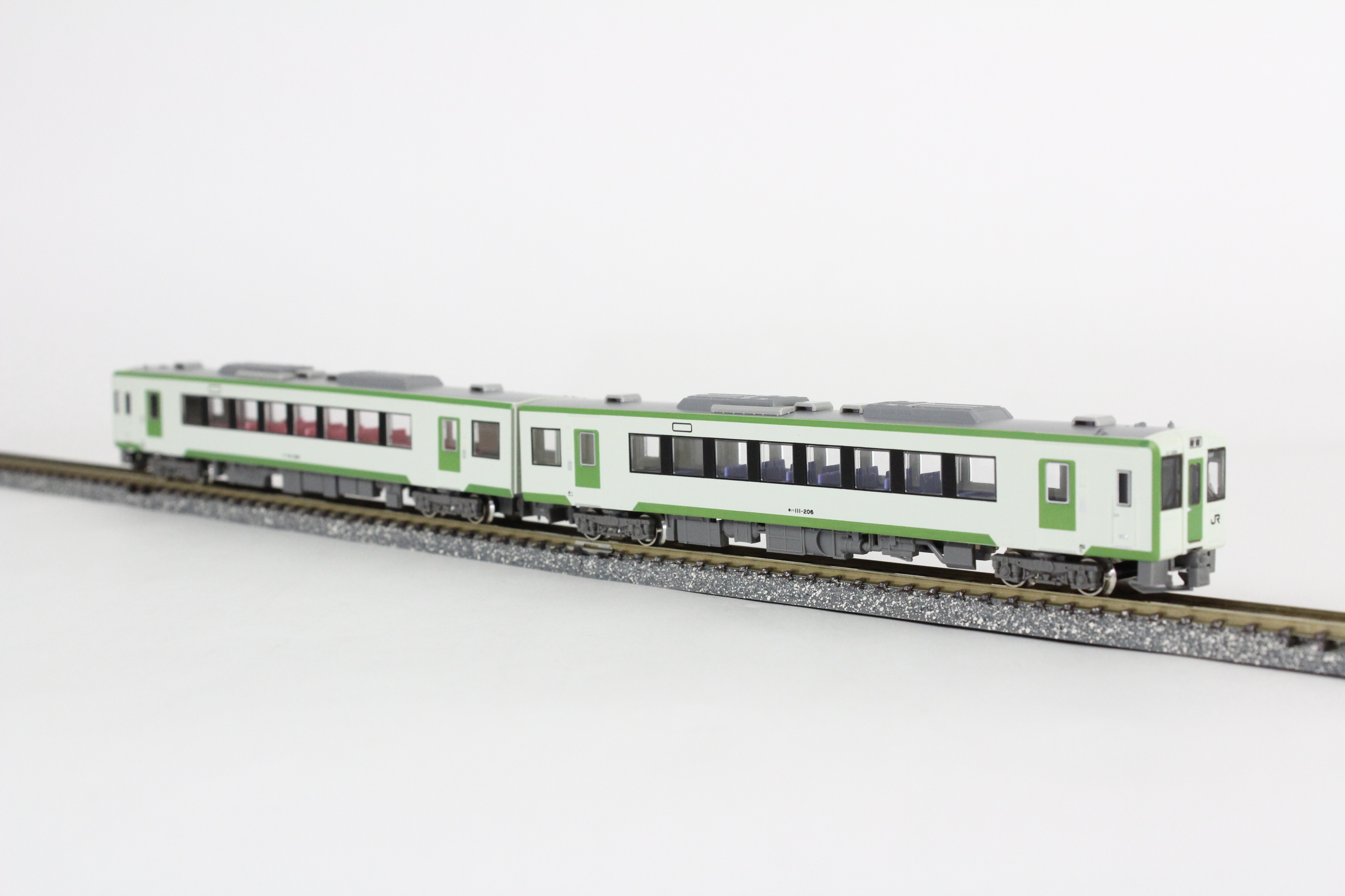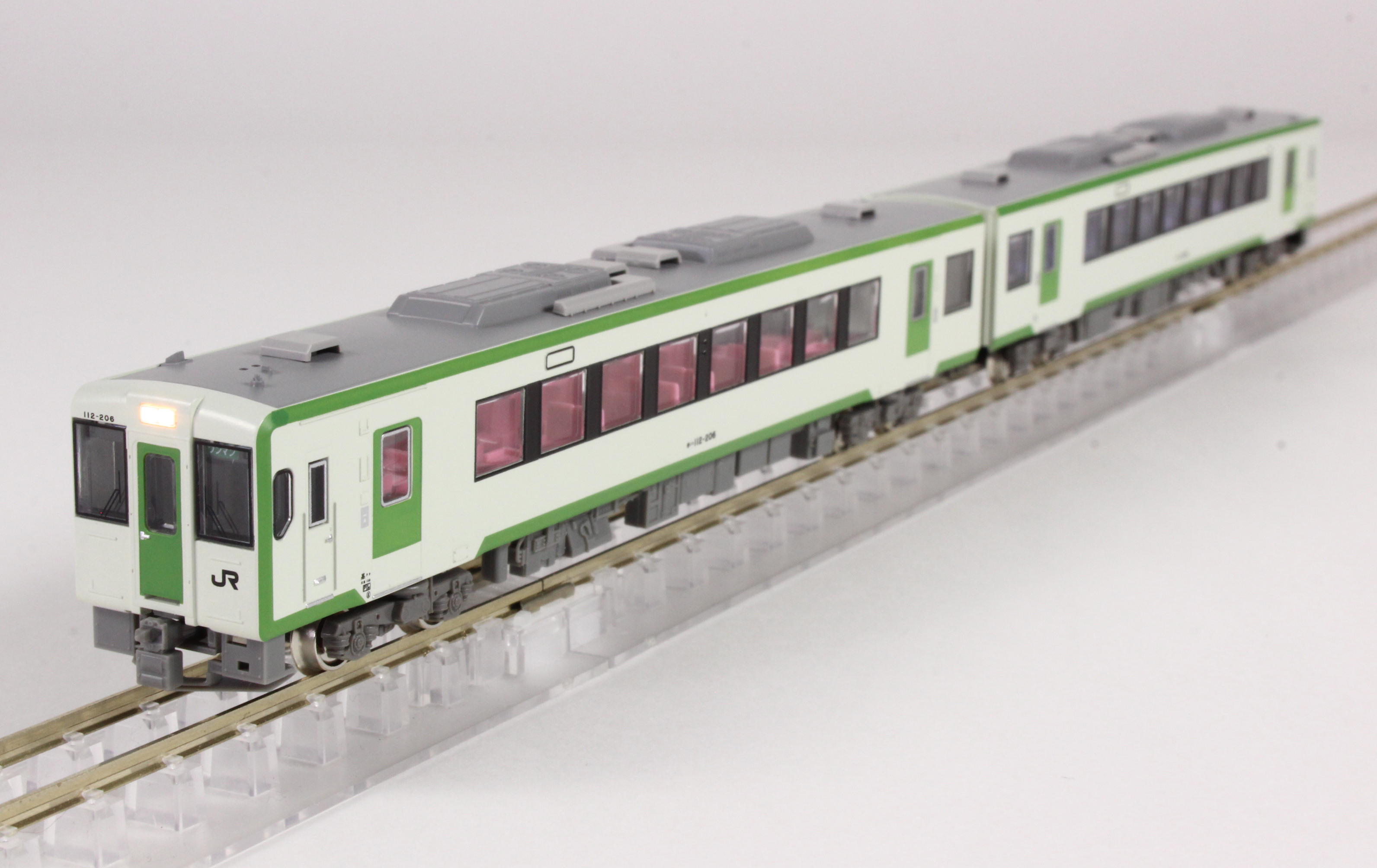 製品は八高線で活躍するキハ111形200番代をモチーフとし、同線に所属する車両の特徴である2段式になった電気連結器と側面LED行先表示を再現します。同系の標準色である、やや緑がかった白ベースにグリーンのアクセントが入った配色の編成を再現します。