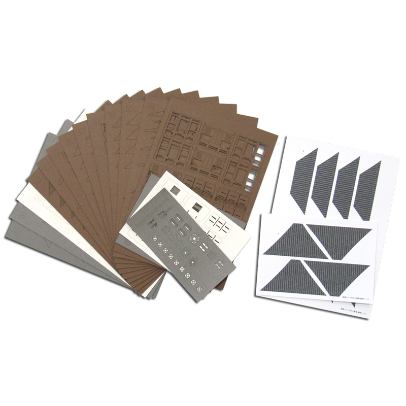 茶色・グレー・白色の厚紙パーツと屋根シートが入っています。