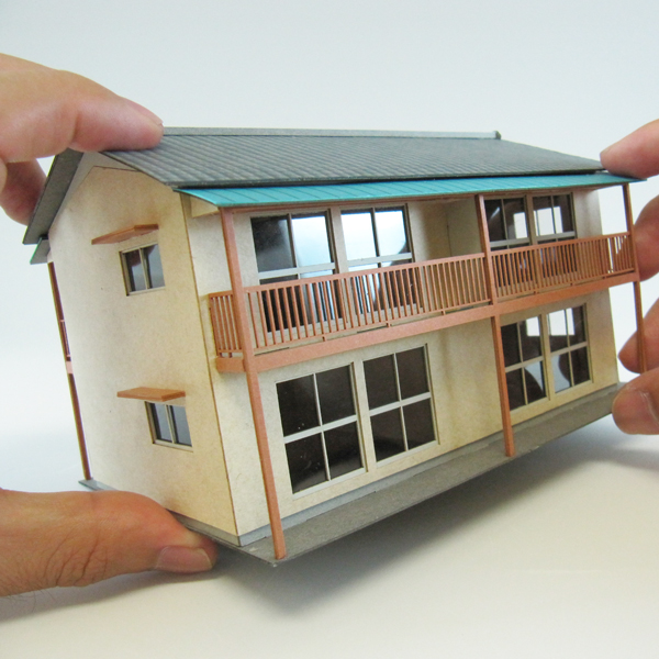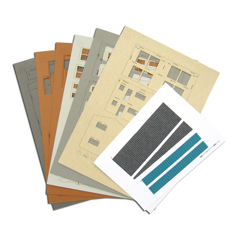 茶・グレー・薄いグレー・ベージュの厚紙パーツと屋根シート、 窓ガラス用のプラ版が入っています。