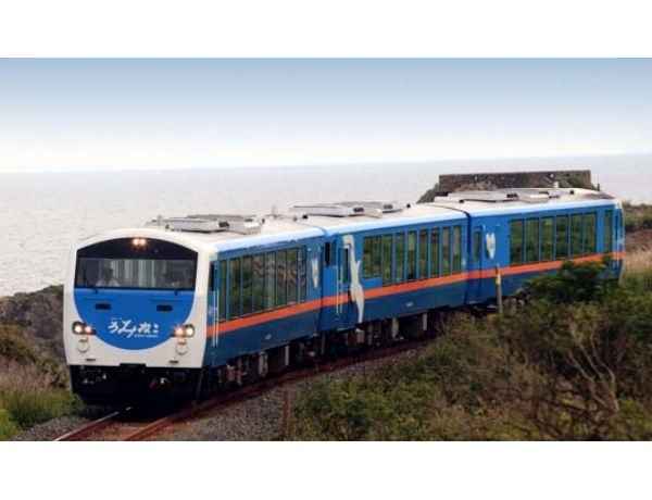 キハ40系は1977(昭和52)年より製造された気動車です。両運転台/片運転台の差やトイレの有無、投入線区 の気候などによってさまざまなバリエーションが誕生しました。2008(平成20)年、仙台・宮城デスティネーショ ンキャンペーンに際して3両のキハ48を改造して登場したジョイフルトレインが「みのり」です。車体色は紅葉を イメージした「深緋(こきひ)色」と落ち着いた漆黒をベースに、稲穂をイメージしたメタリックゴールドの帯を配し 伊達政宗公の兜をモチーフにしたアンティークゴールドの装飾を前面にアクセントとして加えたシックな装い で、客用扉はシルバーで塗装されて華やかさも演出しています。愛称は陸羽東線のキーワード「稲穂」(実り ある収穫)、「温泉」(実りあるひととき)、「紅葉」(実りの秋)そして「実り多い旅にしてほしい」という意味が込めら れて「みのり」と名づけられました。現在も仙台から新庄の間を陸羽東線経由で経由する観光列車として宮城 の魅力を発信しています。2002(平成14)年12月、東北新幹線八戸開業に際して登場したのがリゾート列車「き・ら・き・らみちのく」です。 当初は前面を赤、側面を白とグレーの塗りわけで八戸から下北、津軽方面への観光列車として活躍しました が、東北新幹線新青森延伸と「青森デスティネーションキャンペーン」の開催に際して八戸線の観光列車とし てリニューアルされ「リゾートうみねこ」となりました。車体下部を太平洋のブルー、上部を爽やかな空色のツー トンで塗りわけ、車体腰部に水平線の日の出を現すオレンジ色の帯を配しています。