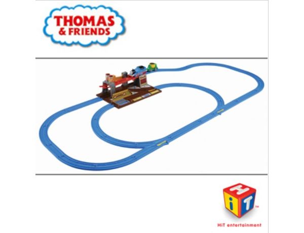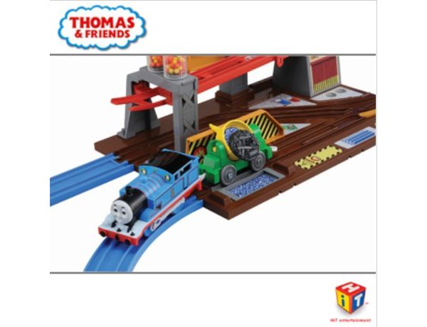 がたごとワークス内にある「壊れたレール」にトーマスがやってくると、レールが落下し、なんとトーマスが1階部分に乗り移って走行します。さらに、2両目の「鉄運搬貨車」は、鉄おきばを通過するときに積荷をおろすアクションをします。