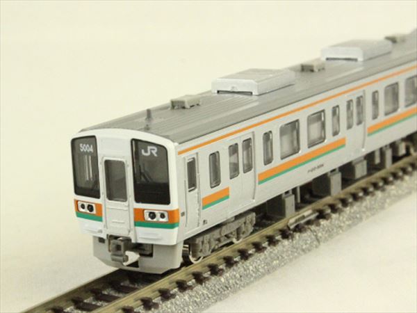 211系5000番台は1988年に登場した基本番台のマイナーチェンジ車両で主な変更点は、前面を213系と同様に貫通扉・助手席窓の天地寸法を拡大、側面に車外スピーカを設置、クーラーは集中型のAU75Gクーラー1基搭載からインバータクーラーAU711を2台搭載といった点が挙げられます。なお、座席はラッシュ時にも対応できるようロングシートとなっています。2両編成(6000番台)、3両編成、4両編成が存在し、242両がJR東海各線区で活躍しています。近年パンタグラフのシングルアーム化、ATS-PT取付によりスカートに保護板が取付されるなどの変化が見られます。