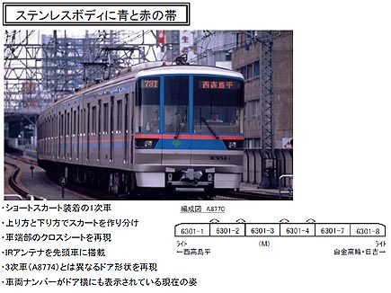 型のFRP製前頭部を組み合わせた車体には三田線をあらわす青と情熱をあらわす赤のラインが入れられて