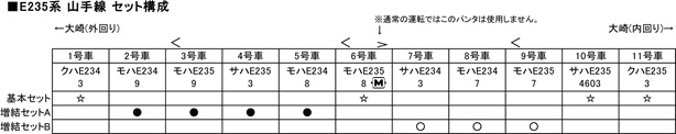 ●E231系500番台より転用されたサハE235-4600番台を収録。アンテナ台座が増設され、クーラーが他のE235系と揃えられた姿を再現