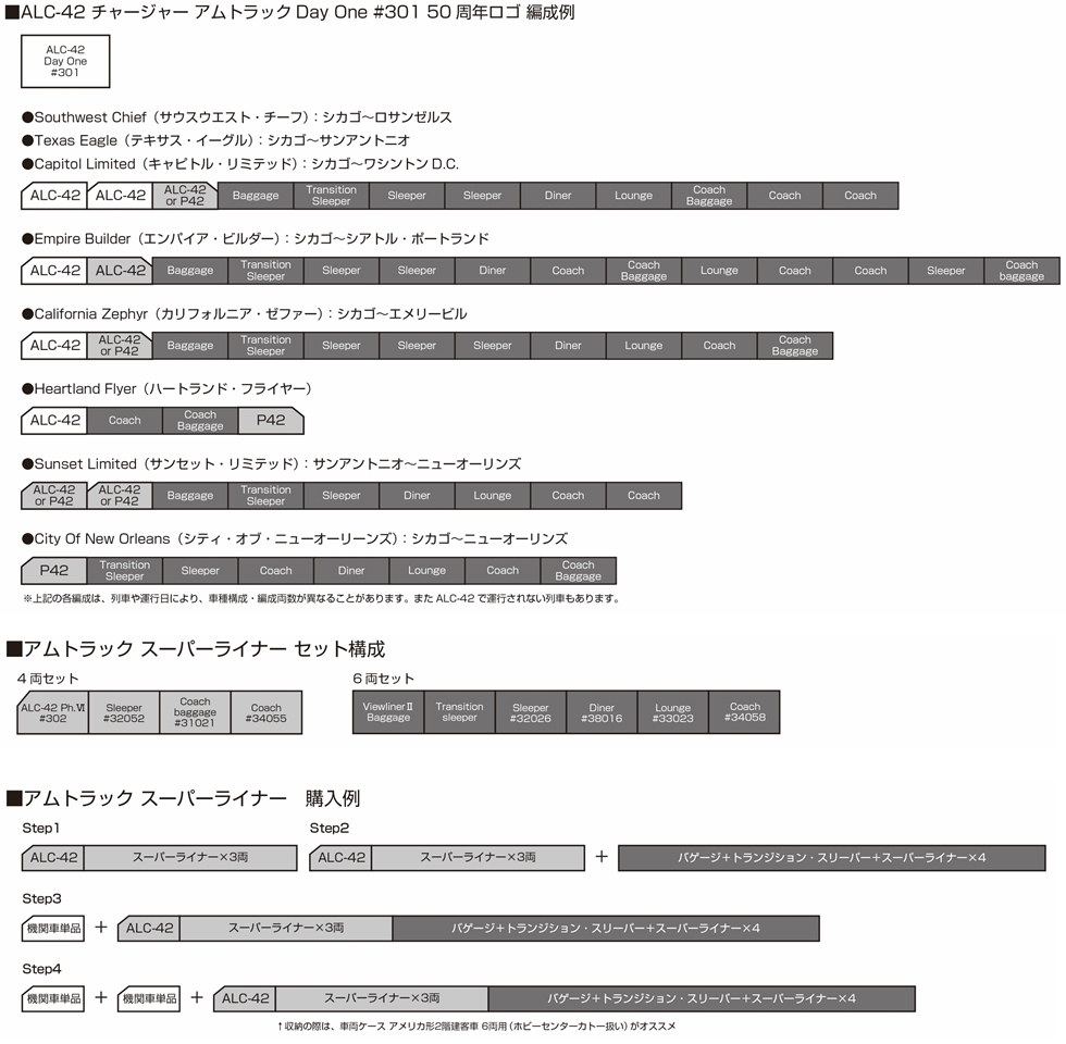 ・4両セットには機関車1両、スリーパー、コーチ・バゲージ、コーチ各1両で構成。6両セットはバゲージ、トランジションスリーパー、スリーパー、ダイナー、ラウンジ、コーチ各1両で構成