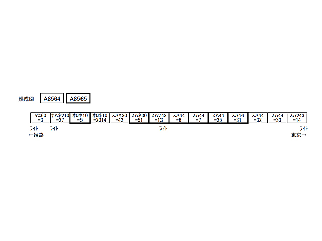 ■マイクロエース A8565 国鉄10系・44系・スハネ30 急行「銀河」増結7両セット戦後の復興期にあたる1949(昭和24)年9月、東京〜大阪間を結ぶ2往復の夜行急行列車が登場しました。このうち1往復(15・16列車)は夜行列車のシンボルとして「銀河」と名づけられ、テールサインの掲出が行われるなど当時としては異例の演出が行われました。翌年10月には好評を受けて運転区間を東京〜神戸間に拡大1956(昭和31)年からは寝台車の連結が開始されるなど順調に発展を続け、1961(昭和36)年10月からは寝台列車化されました。1976(昭和51)年からは20系寝台車、1985(昭和60)年3月からは14系寝台車、1986(昭和61)年からは24系寝台車が使用され、伝統の夜行急行列車の運転が続けられましたが、夜行バスの発達などにともなう利用率の低迷から、2008(平成20)年3月15日に惜しまれながら廃止となりました。10系客車、44系客車から構成される旧型客車のセットですスハフ43のテールライト点灯・青15号の車体。マニ60のみぶどう色塗色・1960年代半ばの急行「銀河」103レ、104レ(東京-姫路)を再現するセット・スハフ43はスハ44からの改造車を再現※部品共用のため窓形状などが一部実車と異なります※客車のみのセットです。走行には別途機関車が必要です。同時発売予定A3604 EF61-6 改良品・青色が好適です。【A8565 増結7両セット内容】オロネ10-5+スハネ30-51+スハフ43-13+スハ44-6+スハ44-7+スハ44-25+スハ44-31