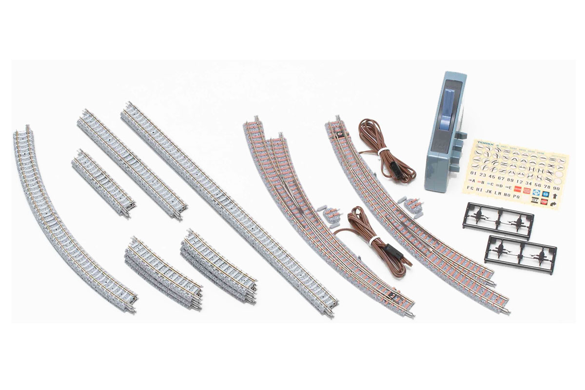 PCまくら木採用のベーシックSD・マイプランLTに加えて、合成樹脂製のまくら木のカーブポイントの待避線を楽しむためのレールパターンEのセットです。
