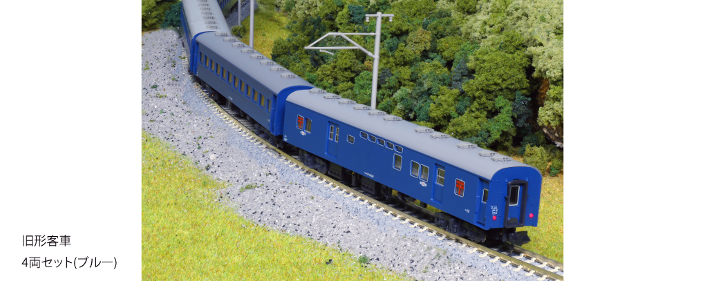 ・昭和39年(1964)以降の国鉄で見られたイメージの、青色の旧形客車列車4両セット。普通列車にも連結されていたオユ10(非冷房)と、スハ43系3両をラインナップ
