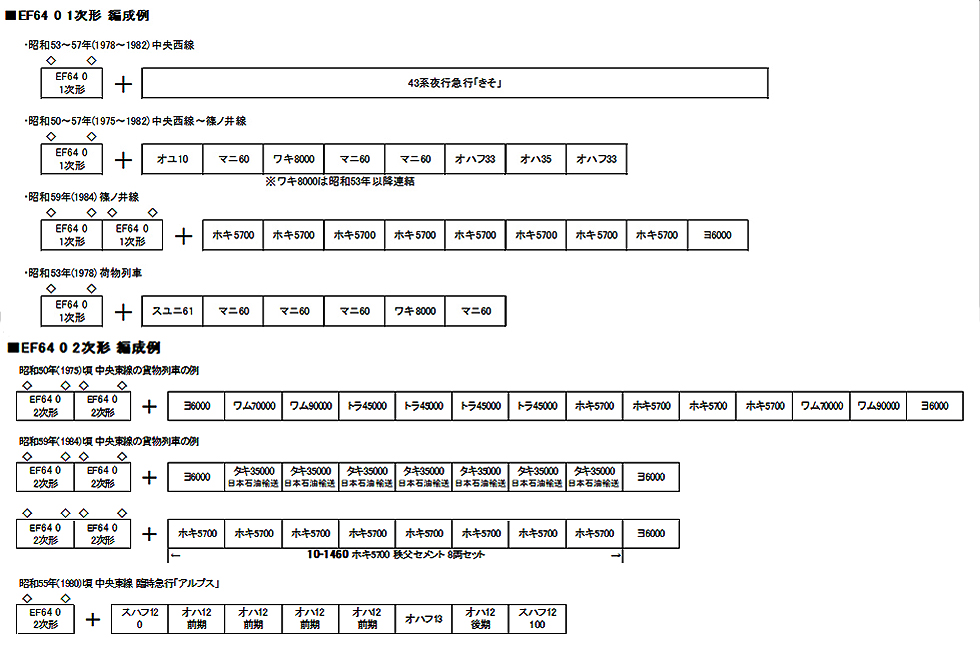EF64 0番台はEF62/EF63をベースとした勾配線区用の標準電気機関車として登場しました。急勾配で安定したブレーキ力を得られる発電ブレーキを備え、そのために側面フィルターが大形化されています。客貨両方の運転を担当した1次形と異なり、2次形は貨物用として製造されたため電気暖房装備を備えておらず、電暖表示灯やスカート部の電暖ジャンパ栓が無い外観が特徴です。単機のほか重連による貨物列車牽引も見られました。