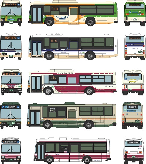 セット内容は新宿駅西口バスターミナルに乗入れている5社局をラインナップし、東京都交通局いすゞ エルガQPG-LV234L3、京王バス三菱ふそう エアロスターLKG-MP37FK、関東バス西工96MC、西武バス三菱ふそう エアロスターQKG-MP37FK、小田急バスいすゞ エルガミオ2KG-LR290J4の各路線バスをラインナップ。