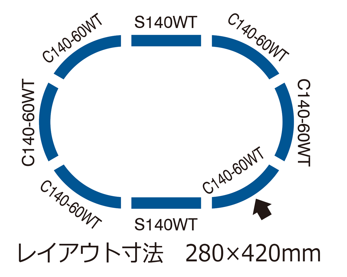 ・ワイドトラムミニカーブレールとワイドトラムストレートレールによる小型でベーシックなレールパターンにパワーユニットFG-17を加えたセットです