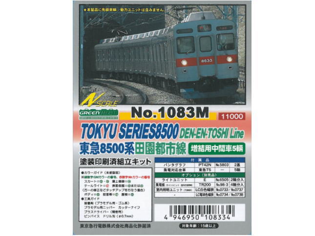★再生産★グリーンマックス 1083M 塗装済キット 東急8500系田園都市線 増結用中間車5両セット 11,326JPY 4946950108334 ※組立キットです※東急8500系田園都市線 増結中間5両編成■詳細■・車体は新規製作・プロトタイプは13次車以降・渋谷寄り8900形の妻面にはIRアンテナとハシゴを表現・一部共通部品を用いるため実車と異なる箇所があります。 評論 共有0個評價我要評價