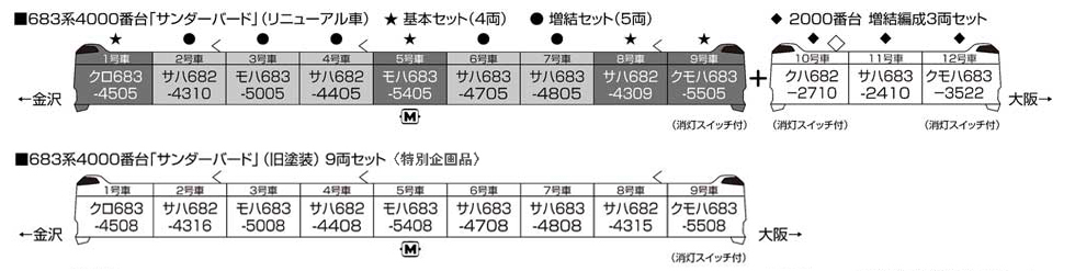 大阪〜金沢・和倉温泉間を結ぶ「サンダーバード」で運用される車両のうち、683系4000番台は2009〜2011年に製造された9両固定編成のグループです。681系・683系0番台とは異なり、両先頭車とも前面貫通扉(クロ683は準備工事)を持つ前頭部やシングルアームパンタグラフを装備した外観が特徴です。また、安全性の向上のためオフセット衝突対策構造が採用されており、妻面にその違いを見ることができます。