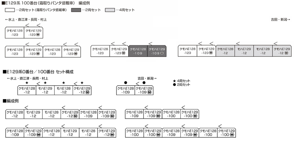 ●●前面表示は両セットとも「普通(水色)新潟」を取付済。交換用行先表示が付属(4両セット:「普通(赤) 村上」・無地×各2両分、2両セット:「ワンマン(ピンク) 直江津」